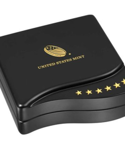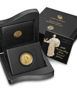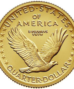 The reverse side of the 2016 1/4 oz American Gold Standing Liberty coin features the American bald eagle in flight, moving from left to right in the coin’s design field. Engravings are the same as the original coins on both sides, with the addition of a “W” mint mark from the West Point Mint and the coin’s weight, purity, and metal content.